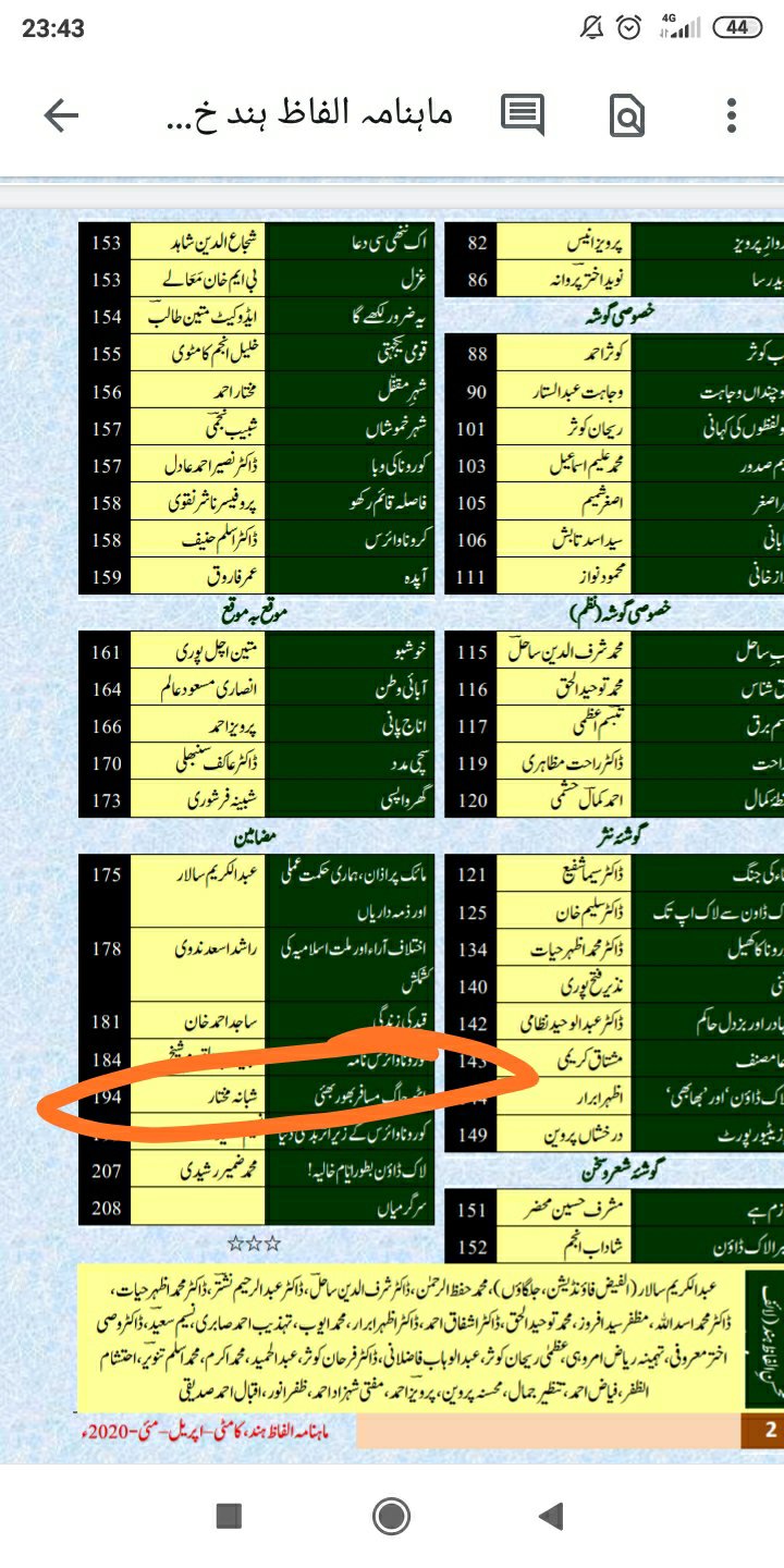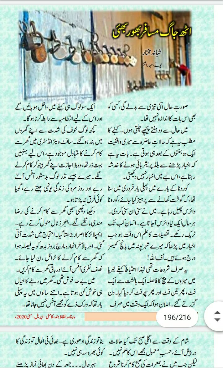 I wrote one essay on my take on the lockdown life, the novel Coronavirus pandemic and my outlook on life and afterlife. It got published in Alfaz-e-Hind the most selling Urdu magazine of central India.