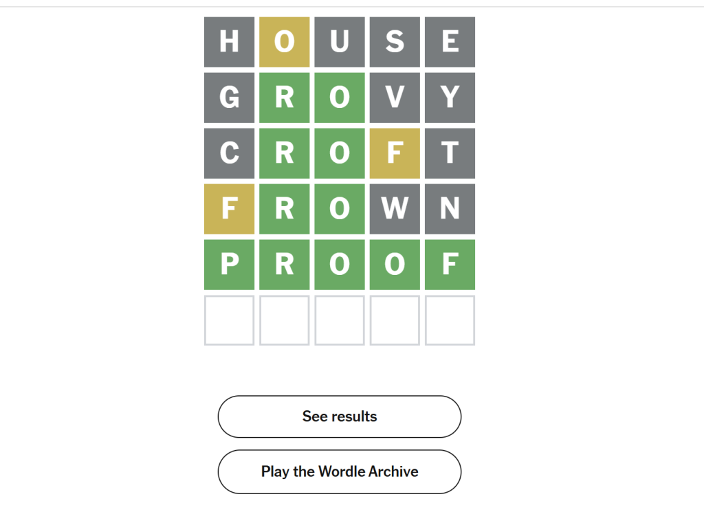 Blog, Puzzles et al Wordle 1658 | PROOF Posted by Shabana Mukhtar on January 2, 2026 Today’s wordle word is: PROOF. 5 attemps, but no mistakes this time. Yayy me! You can play wordle here: https://www.nytimes.com/games/wordle/index.html