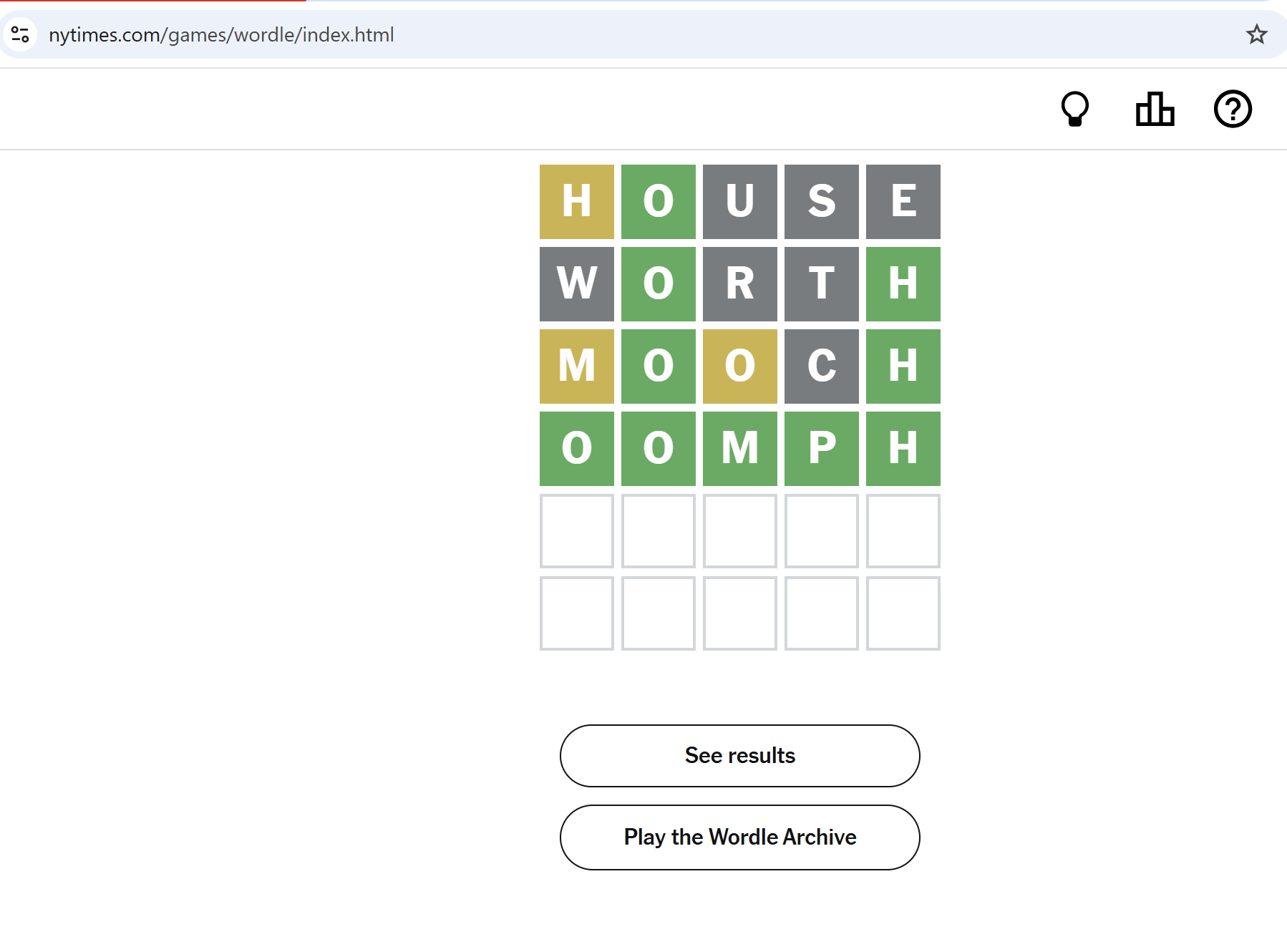 Blog, Puzzles et al Wordle 1662 | MOOCH Posted by Shabana Mukhtar on January 6, 2026 Today’s wordle word is: MOOCH. You can play wordle here: https://www.nytimes.com/games/wordle/index.html