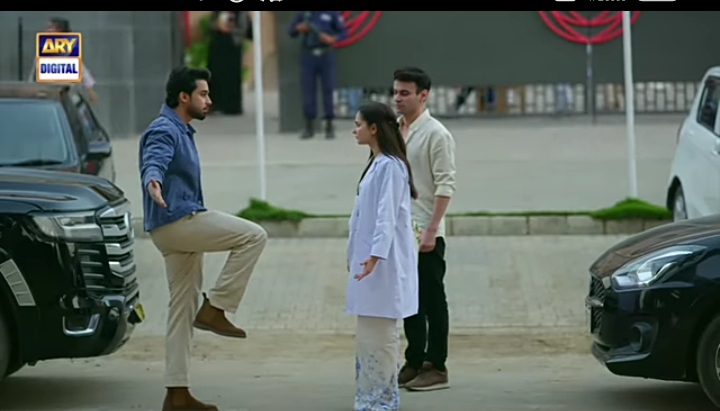 Then, Kamyar meets Ayra at the uni and propsoes to her. He seems genuinely interested in her (so it seems). Ayra tells Falak, Falak sends Nadir to pick up Ayra from uni. Their path is blocked by Kamyar’s car. Uski ugli car ab nahin drive karta woh. Kamyar is genuinely apologizing (so it seems). Ek per pe khada hota hai, because it’s second grade classroom?